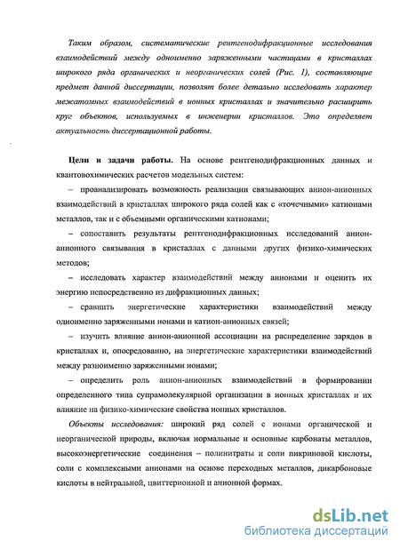 В настоящее время существует лишь небольшое число методов, позволяющих зафиксировать образование АА пар в конденсированном состоянии. Так, сходство спектральных свойств КК или АА ассоциатов с таковыми для энергетически стабильных ионных пар позволяет использовать для их обнаружения электронную спектроскопию поглощения (ЭСП). Данный подход успешно применялся для выявления связывающих КК взаимодействий в различных солях актинидов Ал, содержащих Ап02+ и Ап022+ группы, объединенные Ал...О связями.9 Во всех случаях подобное связывание проявлялось в виде батохромного сдвига в спектрах ЭСП для кристаллов относительно спектров для растворов, величина которого зависела как от числа КК взаимодействий в кристалле, так и от типа образуемого ассоциата. Аналогично, наличие дополнительной полосы переноса заряда в ЭСП спектрах растворов, содержащих гексацианоферрат-анион вместе с Г или S2032" и т.п.,10 указывало на наличие АА пар. Возможность существования связывающих взаимодействий между одноименно-заряженными частицами также подтверждалась данными ИК9 и ЯМР11 спектроскопии. Однако все эти методы предоставляют только качественную информацию об АА (КК) взаимодействиях, тогда как подтверждение возможности их реализации и оценка их прочности возможна лишь на основе топологического анализа экспериментальной функции распределения электронной плотности р(г) в кристалле в рамках теории Р.Ф. Бейдера «Атомы в Молекулах» (AIM).12 Данный подход позволяет как однозначно выделить из всей совокупности контактов связывающие взаимодействия независимо от природы частиц, участвующих в их образовании, так и оценить их энергию (по корреляционной зависимости, предложенной Эспинозой с соавт.13 14) на основе рентгенодифракционных данных. Таким образом, систематические рентгенодифракционные исследования взаимодействий между одноименно заряженными частицами в кристаллах широкого ряда органических и неорганических солей (Рис. 1), составляющие предмет данной диссертации, позволят более детально исследовать характер межатомных взаимодействий в ионных кристаллах и значительно расширить круг объектов, используемых в инженерии кристаллов. Это определяет актуальность диссертационной работы.