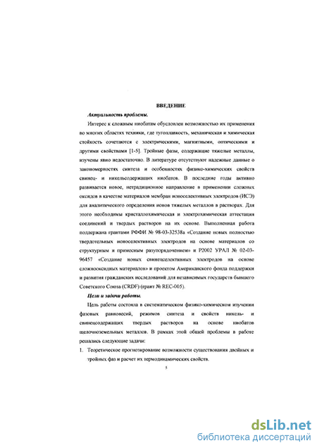 Интерес к сложным ниобатам обусловлен возможностью их применения во многих областях техники, где тугоплавкость, механическая и химическая стойкость сочетаются с электрическими, магнитными, оптическими и другими свойствами. Тройные фазы, содержащие тяжелые металлы, изучены явно недостаточно. В литературе отсутствуют надежные данные о закономерностях синтеза и особенностях физико-химических свойств свинец- и никельсодержащих ниобатов. В последние годы активно развивается новое, нетрадиционное направление применения таких соединений качестве материалов мембран ионоселективных электродов (ИСЭ) для аналитического определения ионов никеля и свинца. Для этого необходимы кристаллохимическая и электрохимическая аттестация соединений и твердых растворов на их основе. Выполненная работа поддержана грантами РФФИ № 98-03-32538а «Создание новых полностью твердотельных ионоселективных электродов на основе материалов со структурным и примесным разупорядочением» и Р2002 УРАЛ № 02-03-96457 «Создание новых свинецселективных электродов на основе сложнооксидных материалов» и проектом Американского фонда поддержки и развития гражданских исследований для независимых государств бывшего Советского Союза (CRDF) (грант № REC-005).