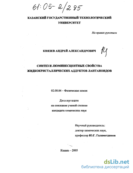 Апробация работы. Основные результаты диссертации докладывались на XX Международной Чугаевской конференции по координационной химии (Ростов-на-Дону, 2001); II, III, IV научных конференциях молодых ученых, аспирантов и студентов научно-образовательного центра КГУ "Материалы и технологии XXI века" (Казань, 2001, 2003, 2004); XVth Workshop on Rare Earths Elements (Mainz, Germany, 2002); 7th European Conference on Liquid Crystals (Jaca, Spain, 2003); 8th International symposium on metallomesogens (Narnur, Belgium, 2003); 5th International conference on f-elements. ICFE'5. (Geneva, Switzerland, 2003); Всероссийской молодежной научно-практической конференции "Инновации в науке, технике, образовании и социальной сфере" (Казань, 2003), XI Всероссийской конференции «Структура и динамика молекулярных систем» (Яльчик, 2004); IV Международной научной конференции «Химия твердого тела и современные микро- и нанотехнологии» (Кисловодск, 2004). Результаты