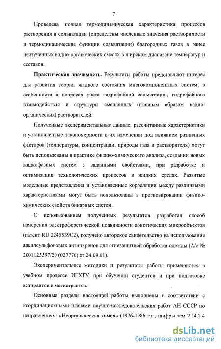 изучение влияния природы благородного газа на растворимость в воде, индивидуальных органических растворителях, в водных растворах гетерофункциональных веществ и в бинарных неводных системах с различной степенью ассоциации компонентов;