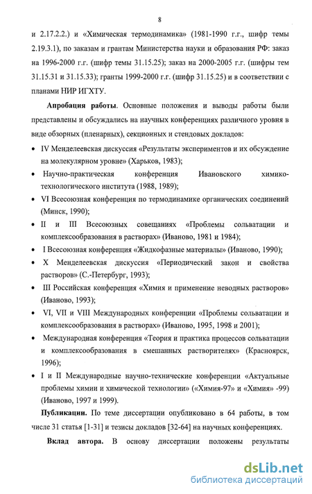 8 и 2.17.2.2.) и «Химическая термодинамика» (1981-1990 г.г., шифр темы 2.19.3.1), по заказам и грантам Министерства науки и образования РФ: заказ на 1996-2000 г.г. (шифр темы 31.15.25); заказ на 2000-2005 г.г. (шифры тем 31.15.31 и 31.15.33); гранты 1999-2000 г.г. (шифр 31.15.25) и в соответствии с планами НИР ИГХТУ.