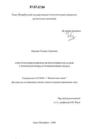 10 спектрофотометрах SPECORD М40 и SPECORD М80, снабженных программным обеспечением и компьютерным интерфейсом. Анализ контуров и поиск спектральных форм различных комплексов в растворах, полимерных пленках и фотоотверждаемых композициях, либо группировок постоянной стехиометрии в стеклах, проводили с использованием разработанной автором программы обработки оптических спектров методом Уоллеса-Каца [15] для Matlab (прил. 2). Он позволяет определить число независимых спектральных форм и сводится к определению числа линейно независимых строк матрицы, составленной из оптических плотностей на фиксированных частотах по каждому экспериментальному спектру, и позволяет объективно оценить число комплексов, сосуществующих в системах. Для более точного определения структуры полос поглощения ПЗ и d-d-переходов анализировали четные производные от исходных спектров. Цели и задачи диссертации: