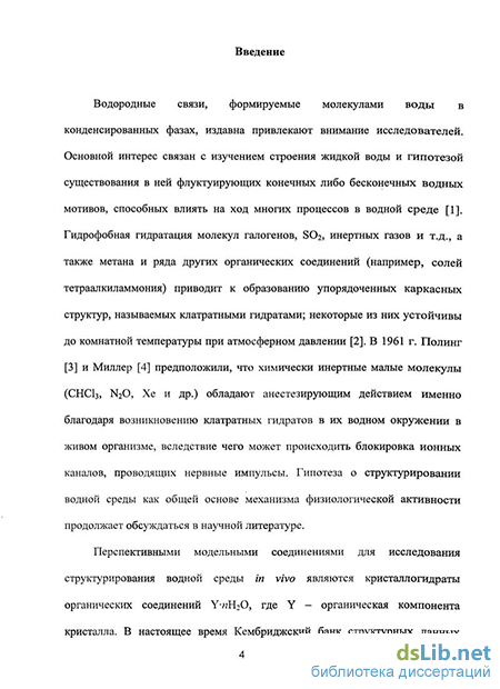 Актуальность темы. Водородные связи, формируемые молекулами воды в конденсированных фазах, издавна привлекают внимание исследователей. Основной интерес связан с изучением строения жидкой воды и гипотезой существования в ней флуктуирующих конечных либо бесконечных водных мотивов, способных влиять на ход многих процессов в водной среде. Гидрофобная гидратация инертных газов, метана и ряда других органических соединений (например, солей тетраалкиламмония) приводит к образованию упорядоченных каркасных структур, называемых клатратными гидратами; некоторые из них устойчивы до комнатной температуры при атмосферном давлении. В 1961 г. Полинг и Миллер предположили, что химически инертные малые молекулы (СНС13, N20, Хе и др.) обладают анестезирующим действием именно благодаря возникновению клатратных гидратов в их водном окружении в живом организме, вследствие чего может происходить блокировка ионных каналов, проводящих нервные импульсы. Гипотеза о структурировании водной среды как общей основе механизма физиологической активности продолжает обсуждаться в научной литературе.