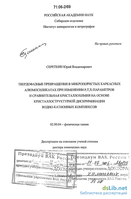 Апробация работы. Материалы, включенные в диссертацию, докладывались на следующих всероссийских и международных конференциях: 3rd Intern. Conference on Natural Zeolites (Havana, Cuba, 1991); Республиканское совещение "Природные цеолиты России" (Новосибирск, 1991); 4th International Conference on Natural Zeolites (Boise, USA, 1993); 16th General Meeting of IMA (Pisa, Italy, 1994); International Conference "Powder Diffraction and Crystal Chemistry" (S.-Petersburg, 1994); International Symposium and Exhibition on Natural Zeolites (Sofia, Bulgaria, 1995); XIII Всероссийская конференция по экспериментальной минералогии (Черноголовка, 1995); 5 International Conference on Natural Zeolites (Naples, Italy, 1997); XIV Международное совещание по рентгенографии минералов (Санкт-Петербург, 1999); Международная конференция "Кристаллогенезис и минералогия" (Санкт-Петербург, 2001); XIV Всероссийская конференция по экспериментальной минералогии (Черноголовка, 2001); IV Международный симпозиум "Минералогические Музеи" (Санкт-Петербург, 2002); 6th International Conference on Natural Zeolites (Thessaloniki, Greece, 2002); Всероссийская научная конференция "Геология, геохимия и геофизика на рубеже XX и XXI веков" (Иркутск, 2002); III Национальная кристаллохимическая конференция (Черноголовка, 2003); XIV конкурс-конференция имени академика А.В.Николаева (Новосибирск, 2004);