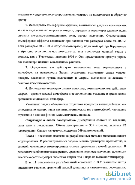 Цели и задачи диссертации. Основной целью диссертации являлись разработка общего подхода и определение общих закономерностей взаимодействия атмосферы с космическими телами разного размера — от метров до тысячи километров. Исследование явлений, сопровождающих взаимодействие падающих на Землю космических тел с ее атмосферой и поверхностью, и их последствий проводилось со следующими практическими целями: определения параметров космических тел по наблюдательным данным; оценки воздействия ударов на окружающую среду для выявления геофизических последствий и факторов, опасных для живых организмов и человека; идентификации возможных следов ударов космических тел и интерпретации геологических данных; определения роли ударов в эволюции атмосферы и поверхности Земли на ранней стадии ее существования. Для достижения поставленных целей решались следующие конкретные задачи.