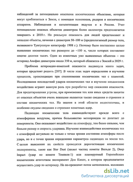 Проблема астероидно-кометной опасности выдвинула много задач, которые предстоит решить [207]. В числе этих задач определение и изучение процессов, происходящих при столкновении космических тел с планетой. Исследования последствий ударов космических тел и изучение механизмов воздействия играют важную роль при разработке мер снижения опасности. Для предотвращения угрозы, при применении тех или иных средств защиты от опасных объектов очень важными являются также сведения о строении и составе космических тел. Но знания в этой области недостаточны, и особенно скудны сведения о строении кометных ядер.