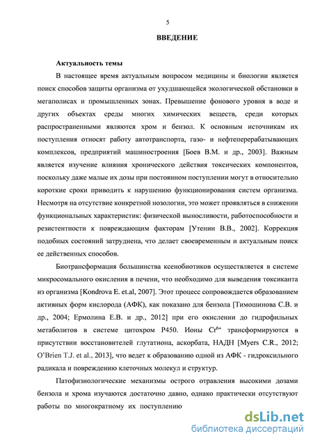 На основе санитарно-гигиенического исследования в Оренбургской Медицинской Академии разработана модель подострой интоксикакции смесью: К2Cr2О7 и бензола, изучающая на донозологическом этапе эффекты малых доз этих токсикантов у людей, работающих на промышленных предприятиях, или живущих в зоне высокого уровня антропогенного загрязнения [Боев В.М. и др., 2003; Утенин В.В., 2002]. Выбор токсикантов был обусловлен значительным превышением фонового уровня содержания хрома и бензола в объектах среды в промышленных городах, выявленным при санитарно-гигиенических исследованиях, проведенных в Оренбургской области [Пинигин М.А., 2001; Утенин В.В., 2002]. Подобраны дозы бензола в несколько раз ниже LD50.