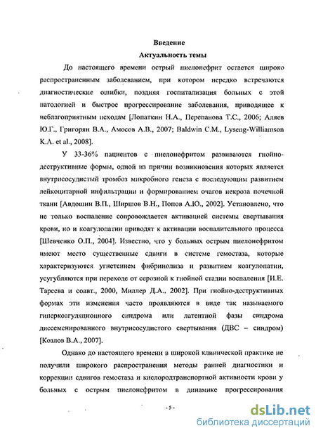 У 33-36% пациентов с пиелонефритом развиваются гнойно-деструктивные формы, одной из причин возникновения которых является внутрисосудистый тромбоз микробного генеза с последующим развитием лейкоцитарной инфильтрации и формированием очагов некроза почечной ткани [Авдошин В.П., Ширшов В.Н., Попов А.Ю., 2002]. Считается, что не только воспаление сопровождается активацией системы свертывания крови, но и коагулопатии приводят к активации воспалительного процесса: воспаление, вызванное инфекционным агентом, способствует активации коагуляции и накоплению фибрина, которые затем становятся патологическими факторами, провоцирующими прогрессирование заболевания [Шевченко О.П., 2004].