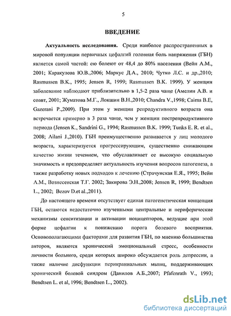 Актуальность проблемы. Среди наиболее распространенных в мировой популяции первичных цефалгий головная боль напряжения (ГБН) является самой частой: ею болеют от 48,4 до 80% населения (Rasmussen В.К., 1995; Jensen R, 1999; Rasmussen В.К. 1999; Вейн A.M., 2001; Каракулова Ю.В.,2006; Маркус Д.А., 2010). У женщин заболевание наблюдают приблизительно в 1,5-2 раза чаще (Chandra V., 1998;Амелин А.В. и соавт, 2001) При этом у женщин репродуктивного возраста она встречается примерно в 3 раза чаще, чем у женщин пострепродуктивного периода (Jensen К., Sandrini G., 1994; Rasmussen В.К. 1999). ГБН преимущественно развивается у лиц молодого возраста, характеризуется прогрессирующим, существенно снижающим качество жизни течением, что обусловливает ее высокую социальную значимость и предопределяет актуальность изучения вопросов патогенеза, а также разработку новых подходов к лечению (Страчунская Е.Я., 1996; Jensen R, 1999; Вейн A.M., 2002; Bendtsen L., 2002; Каннер P., 2006; Ролак Л.А.,2008; Закирова Э.Н.,2009).