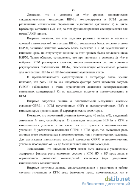 Доказано, что в условиях in vivo срочная гипоксическая сукцинатзависимая экспрессия HIF-la контролируется в КГМ двумя различными механизмами образования эндогенного сукцината: а) в цикле Кребса при активации СДГ и б) за счет функционирования специфического для мозга ГАМК-шунта.