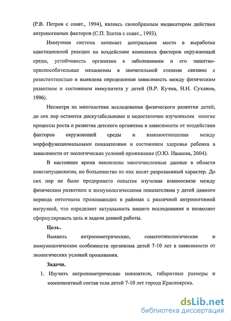 В настоящее время накоплены многочисленные данные в области конституциологии, но большинство из них носят разрозненный характер. До сих пор не было предпринято попыток изучения взаимосвязи между физическим развитием и иммунологическими показателями у детей данного периода онтогенеза проживающих в районах с различной антропогенной нагрузкой, что определяет актуальность нашего исследования и позволяет сформулировать цель и задачи данной работы.