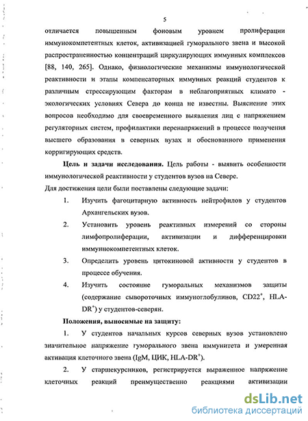 Особый интерес представляет комплексное исследование иммунного статуса студентов, проживающих на территории Европейского Севера. Нарушение иммунной регуляции гомеостаза приводит к срыву адаптационных механизмов и развитию дезадаптационных реакций, хронической патологии, снижению репродуктивной функции (Б.В. Алешин, 1981, Л.А. Проскурякова, 2006). Иммунологическая реактивность у лиц репродуктивного возраста на Севере отличается повышенным фоновым уровнем пролиферации иммунокомпетентных клеток, активизацией гуморального звена и высокой распространенностью концентраций циркулирующих иммунных комплексов (Л.С. Щёголева, 1996, Е.Б. Корниенко, 2002, Л.К. Добродеева, 2004). Однако, физиологические механизмы иммунологической реактивности и этапы компенсаторных иммунных реакций студентов к различным стрессирующим факторам в неблагоприятных климато - экологических условиях Севера до конца не известны. Выяснение этих вопросов необходимо для своевременного выявления лиц с напряжением регуляторных систем, профилактики перенапряжений в процессе получения высшего образования в северных вузах