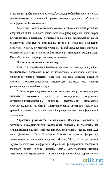 В специальных работах, посвященных спортивным бальным танцам, рассматриваются в основном методические аспекты организации тренировочного процесса танцоров [Т.С. Лисицкая, 1987; Е.Д. Кузнецов с соавт., 2000; А.А. Коваленко, 2000, 2001; Н.В. Рубинштейн, 2002; Л.В. Браиловская, 2003, 2005; А. Мур, 2004]. Немногочисленные публикации, освещающие особенности адаптационных процессов при занятиях бальными танцами и родственными им видами деятельности, свидетельствуют о значительном напряжении в деятельности систем организма танцоров, артистов балета, в том числе сердечно-сосудистой и вегетативной нервной системы, опорно-двигательного аппарата [Л.В. Пискунова, 2000, 2002; В.Б. Болтвина, 2003,2004; В.Б. Бутузова, 2004; О.Л. Коннова с соавт., 2003, 2005].
