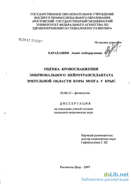Харахашян Анаит Абмарцумовна. Оценка кровоснабжения эмбрионального нейротрансплантата зрительной области коры мозга у крыс : диссертация ... кандидата биологических наук : 03.00.13 / Харахашян Анаит Абмарцумовна; [Место защиты: ГОУВПО "Кубанский государственный медицинский университет"].- Краснодар, 2007.- 132 с.: ил.