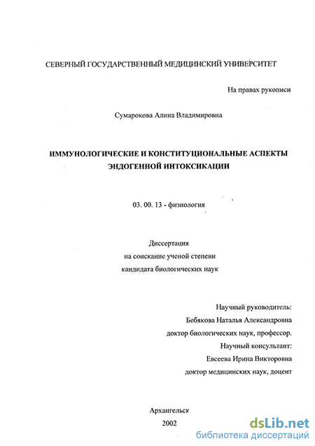 Сумарокова Алина Владимировна. Иммунологические и конституциональные аспекты эндогенной интоксикации : диссертация ... кандидата биологических наук : 03.00.13.- Архангельск, 2002.- 183 с.: ил. РГБ ОД, 61 03-3/813-0