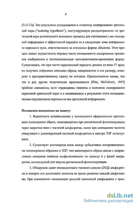 Между тем, много лет назад было выдвинуто предположение ("scanning hypothesis"), что альфа-ритм - это отображение сканирования зрительной коры, считывания с нее информации для последовательной передачи ее в другие корковые области. В наиболее разработанном виде эту идею выдвинули Питтс и МакКаллок [Pitts, McCulloch 1947], которые предположили, что через каждые 100 мс в корковой проекции центра поля зрения возникает волна возбуждения, распространяющаяся за 100 мс до границ этой зоны. Суммация этой движущейся волны с рельефом возбуждения, созданным в коре сигналами из сетчатки глаза, последовательно повышает вероятность разрядов корковых нейронов, расположенных все дальше от центра зрительной коры, что и приводит к последовательному считыванию информации для передачи ее в другие области коры, где производится их дальнейшая обработка и опознание образов. Авторы идеи считали, что такое сканирование обеспечивает инвариантность опознания формы объектов к изменению их размера, сдвига и поворота в поле зрения. Кроме того, они полагали, что последовательное сканирование зрительной коры выгодно для пространственно-временного представления информации на выходе зрительной коры в противоположность ее чисто пространственному представлению, если сканирование отсутствует. При этом может быть достигнуто и существенное уменьшение числа волокон, связывающих первичную зрительную кору с другими корковыми зонами, и такой "кабель" может быть упакован в ограниченное пространство в белом веществе затылочных долей мозга. Несмотря на всю привлекательность этой гипотезы, прямое обнаружение сканирующего процесса, связанного с альфа-ритмом зрительной коры, долгое время было невозможно в связи с рядом технических трудностей. Так, в самой коре до сих пор прямо не обнаружены волны, движущиеся со скоростью нескольких метров в секунду (оценка скорости сканирующей волны на основе известного размера зрительной коры человека [Блинков 1964] и времени распространения альфа-волны). Между тем, появились прямые демонстрации более медленного (до нескольких десятков мм с ) распространения волнового процесса в зрительной коре [Shevelev 1993, 1997] и обонятельной луковице [De-laney 1994] животных, что порождало надежду на прямую визуализацию со временем и движущихся альфа-волн. На данном этапе развития методов ней-ровизуализации для проверки сканирующей гипотезы приходилось оперировать, в основном, с ее косвенными следствиями. Ряд таких следствий гипотезы сканирования был сформулирован И.А. Шевелевым, а первые проверки косвенных следствий этой гипотезы дали положительные результаты [Шевелев и др. 1985-1996]. Среди этих следствий важную роль отводили зрительным иллюзиям, возникающим при ритмической фотостимуляции, которые в определенных условиях делают возможным восприятие человеком волны альфа-ритма собственного мозга в результате «квазистробоскопического» эффекта [Шевелев и др. 1996]. Однако эти исследования были психофизиологическими и не затрагивали электрофизиологическую сторону вопроса, хотя такая проверка представляется существенным и необходимым шагом в анализе макромеханизмов таймирования и обработки информации в первичной зрительной коре. В связи с этим была сформулирована цель настоящего исследования. Цель исследования: