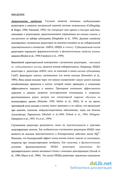 Актуальность проблемы. Глутамат является основным возбуждающим медиатором в синапсах центральной нервной системы позвоночных (Collingridge & Singer, 1990; Nakanishi, 1992). Он опосредует свое прямое и быстрое действие, связываясь с рецепторами, представляющими управляемые им ионные каналы, и построенные из набора субъединиц (Dingledine et al., 1999). Деление семейства ионотропных глутаматных рецепторов на подтипы основано на их избирательной чувствительности к агонистам: АМПА, НМДА и каинату. Субъединичный состав рецепторов определяет фармакологические и физиологические свойства ионных каналов (Bochet et al., 1994;Yamakura et al., 1999).