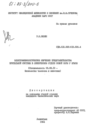 - 4 -Если допустить, что лимбическая кора действительно является древним образованием новой коры, особый интерес вызывает наличие в ней представительств экстероцептивных сенсорных систем, рассматриваемых традиционно как более позднее, по сравнению с обонятельными и висцеральными проекциями, приобретение конечного мозга в ходе эволюции, приобретение, с которым связано возникновение и бурное прогрессивное развитие новой коры. Наше внимание в настоящей работе было сосредоточено на зрительной системе -важнейшей экстероцептивной системе позвоночных.