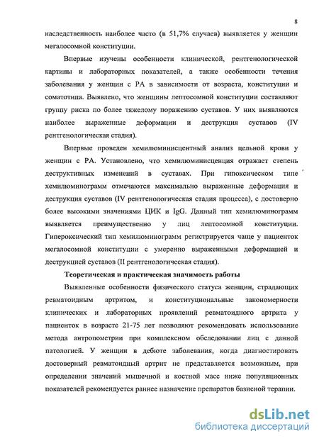 Впервые изучены особенности клинической, рентгенологической картины и лабораторных показателей, а также особенности течения заболевания у женщин с РА в зависимости от возраста, конституции и соматотипа. Выявлено, что женщины лептосомной конституции составляют группу риска по более тяжелому поражению суставов. У них выявляются наиболее выраженные деформации и деструкция суставов (IV рентгенологическая стадия).