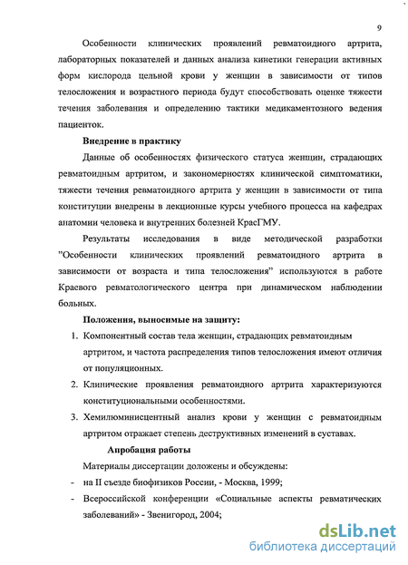 Данные об особенностях физического статуса женщин, страдающих ревматоидным артритом, и закономерностях клинической симптоматики, тяжести течения ревматоидного артрита у женщин в зависимости от типа конституции внедрены в лекционные курсы учебного процесса на кафедрах анатомии человека и внутренних болезней КрасГМУ.