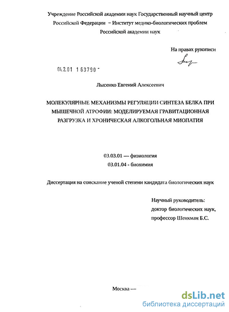 Лысенко, Евгений Алексеевич. Молекулярные механизмы регуляции синтеза белка при мышечной атрофии: моделируемая гравитационная разгрузка и хроническая алкогольная миопатия : диссертация ... кандидата биологических наук : 03.03.01, 03.01.04 / Лысенко Евгений Алексеевич; [Место защиты: Ин-т мед.-биол. проблем].- Москва, 2011.- 131 с.: ил. РГБ ОД, 61 11-3/1136