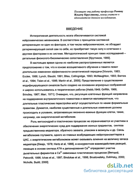 В настоящее время одним из наиболее распространенных является предположение о том, что в основе ассоциативного обучения и памяти лежит длительное изменении эффективности синаптической передачи [Voronin, 1983; Eccles, 1986; Lynch, Staubli, 1991; Bliss, Collingridge, 1993; McNaughton, 1993; Barnes et al., 1994; Tsien et al., 1996; Martin et al., 2000]. Представление о существовании модифицирующихся синапсов было создано на основании априорных соображений и широко использовалось в теоретических работах [Hebb,1949; Griffith, 1966; Brindley, 1967; Marr, 1971]. Очевидно, что, регуляция клеточных функций направлена на поддержание внутриклеточного гомеостаза и кажется маловероятным, что длительные пластические перестройки могут осуществляться по неким формальным правилам. Думается, наиболее существенные и длительные изменения должны происходить в условиях, затрагивающих жизненно-важные функции клетки, такие, например, как энергетический метаболизм.