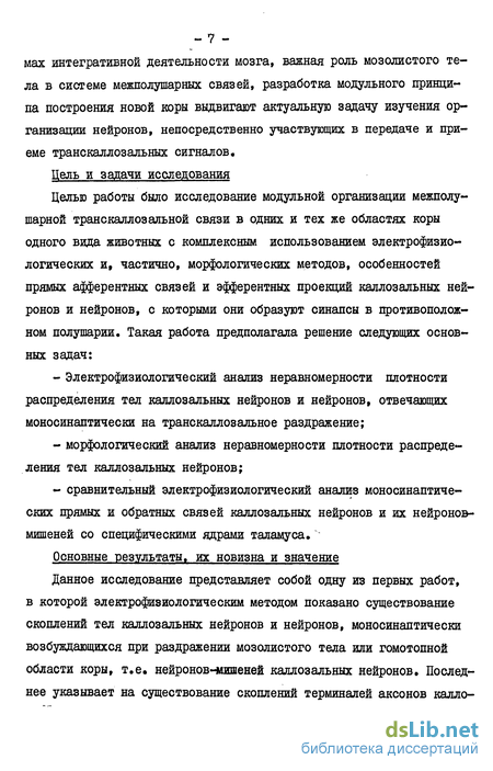 Таким образом участие межполушарных связей в тонких механиз мах интегративной деятельности мозга, важная роль мозолистого тела в системе межполушарных связей, разработка модульного принципа построения новой коры выдвигают актуальную задачу изучения организации нейронов, непосредственно участвующих в передаче и приеме транскаллозальных сигналов.