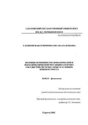 Глушковская-Семячкина Оксана Валерьевна. Половые особенности симпатической и парасимпатической регуляции сердечно-сосудистой системы у крыс в условиях покоя и стресса : диссертация ... кандидата биологических наук : 03.00.13.- Саратов, 2002.- 135 с.: ил. РГБ ОД, 61 03-3/415-1
