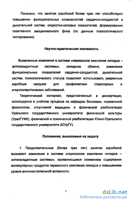1. Продолжительные (более трех лет) занятия аэробикой вызывают изменения в системе «перекисное окисление липидов -антиоксидантные системы», проявляющиеся снижением содержания молекулярных продуктов перекисного окисления липидов и повышением уровня антиокислительной активности.
