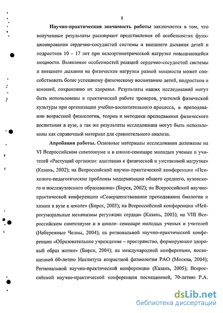 Апробация работы. Основные материалы исследования доложены на VI Всероссийском симпозиуме и в школе-семинаре молодых ученых и учителей «Растущий организм: адаптация к физической и умственной нагрузке» (Казань, 2002); на Всероссийской научно-практической конференции «Психолого-педагогические проблемы модернизации общего среднего, вузовского и послевузовского образования» (Бирск, 2002); на Всероссийской научно-практической конференции «Совершенствование преподавания биологии и химии в вузе и школе» (Бирск, 2003); на Всероссийской конференции «Ней-рогуморальные механизмы регуляции сердца» (Казань, 2003); на VIII Всероссийском симпозиуме и в школе- семинаре молодых ученых и учителей (Набережные Челны, 2004); на региональной научно-практической конференции «Образовательное учреждение - пространство, формирующее здоровый образ жизни» (Бирск, 2004); на международной конференции, посвященной 60-летию Института возрастной физиологии РАО (Москва, 2004); Региональной научно-практической конференции (Казань, 2005); Всероссийской научно-практической конференции посвященной, 70-летию Р.А.