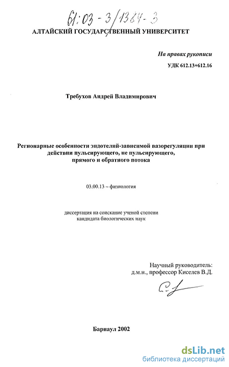 Требухов Андрей Владимирович. Региональные особенности эндотелий-зависимой вазорегуляции при действии пульсирующего, непульсирующего, прямого и обратного потока : диссертация ... кандидата биологических наук : 03.00.13.- Барнаул, 2002.- 123 с.: ил. РГБ ОД, 61 03-3/1384-3