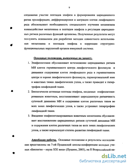 Научная новизна. В работе впервые проведено комплексное изучение дифференцированного воздействия мелатонина и комплекса биологически активных пептидов эпифиза на ритмичность процессов пролиферации, дифференцировки и миграции клеток лимфоидного ряда. Впервые установлена ведущая роль эпифиза в формировании циркадианного ритма пролиферации, дифференцировки и миграции клеток в периферических органах лимфоидного кроветворения, в осуществлении которой принимает участие как гормон эпифиза мелатонин, так и его биологически активные олигопептиды.