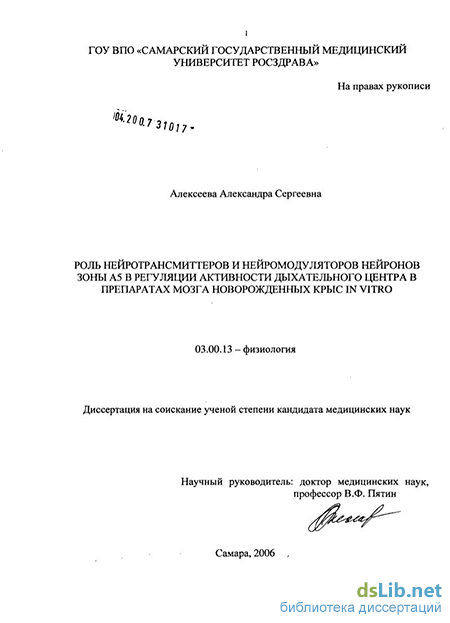 Алексеева Александра Сергеевна. Роль нейротрансмиттеров и нейромодуляторов нейронов зоны А5 в регуляции активности дыхательного центра в препаратах мозга новорожденных крыс in vitro : диссертация ... кандидата медицинских наук : 03.00.13 / Алексеева Александра Сергеевна; [Место защиты: ГОУВПО "Самарский государственный медицинский университет"].- Самара, 2006.- 174 с.: ил.