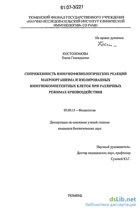 Основные положения работы доложены на Международной конференции «Криосфера земли как среда жизнеобеспечения» (Пущино, 2003); Ш-й конференции иммунологов Урала (Челябинск, 2003); V-й конференции иммунологов Урала (Уфа, 2005); совместном заседании Ученого совета ТФ ГУ НИИКИ СО РАМН и «НИИ общей и прикладной криологии» ТюмГНГУ (Тюмень, 2006); Международной конференции «Теория и практика оценки криосферы земли и прогноз ее изменений» (Тюмень, 2006). Материалы работы были включены в методические рекомендации «Криотерапия в практике врача клинициста». - Тюмень, 2005. -26 с.