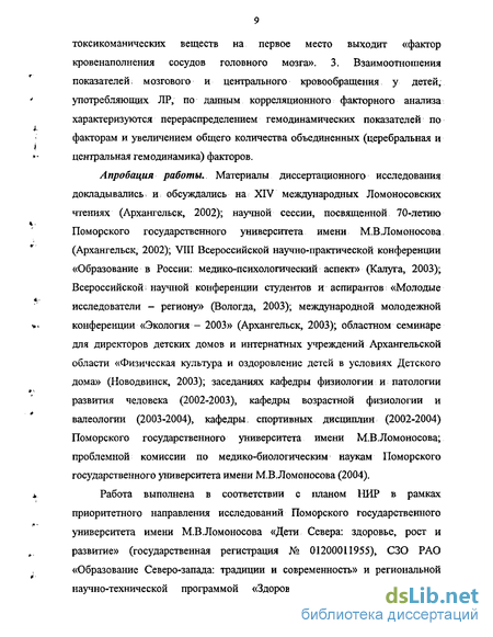 Научно-практическая значимость исследования. Полученные результаты і исследования церебральной гемодинамики; у детей, употребляющих ЛР,1 позволяют дополнить и уточнить особенности действия токсикоманическюс веществ нейротоксического характера на основе летучих углеводородов группы «неэлектролиты» на состояние мозгового кровообращения человека. Полученные качественные и количественные характеристики органной гемодинамики могут применяться для изучения онтогенеза, адаптогенеза,. клинико-физиологического мониторинга ив функциональной диагностике. Материалы исследования используются в учебно-воспитательной работе МУ Детский дом № 18 г. Архангельска (акт внедрения от 15 января 2003 года), МУ «Социально-реабилитационный центр для несовершеннолетних» (акт внедрения от 11 марта 2003 года) и МОУ «Детский дом для детей-сирот и детей, оставшихся без попечения родителей» г. Новодвинска (акт внедрения от 05 мая 2003 года), включены в учебные курсы по возрастной физиологии и психопатологии для студентов Поморского государственного университета имени М.В.Ломоносова (акт внедрения от 10 марта 2004 года), нашли отражение в методических рекомендациях «Интегральная реография тела у подростков: анализ и интерпретация» (Архангельск, 2004).