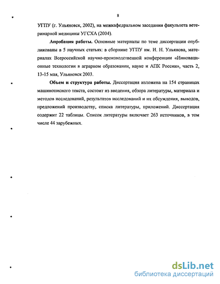 Объем и структура работы. Диссертация изложена на 154 страницах машинописного текста, состоит из введения, обзора литературы, материала и методов исследований, результатов исследований и их обсуждения, выводов, предложений производству, списка литературы, приложений. Диссертация содержит 22 таблицы. Список литературы включает 263 источников, в том числе 44 зарубежных.
