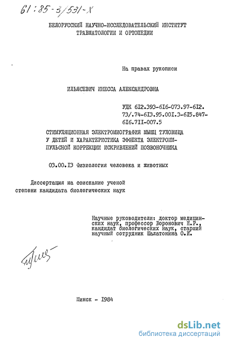 Клинико-физиологическое обоснование и разработка актуальных в научно-практическом отношении задач и составили основное содержание диссертации. Ее главными разделами являются: анализ показателей М-волны симметричных мышц туловища у детей с нормальной осанкой; выяснение закономерностей их изменения на вы-