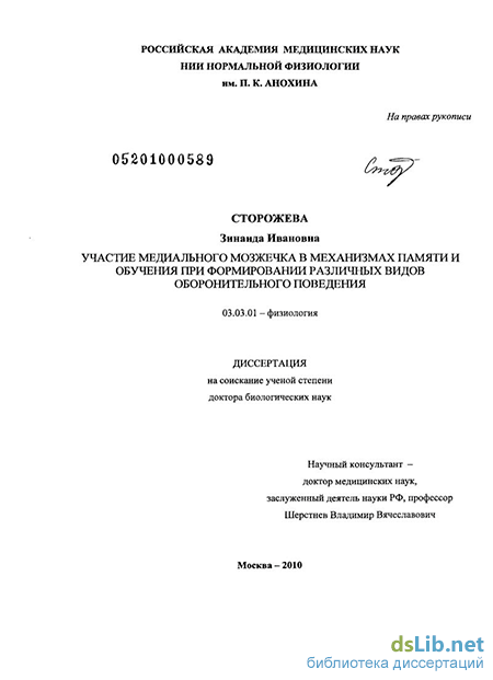 Теоретическая и практическая значимость работы. Полученные результаты расширяют и углубляют имеющиеся теоретические представления об участии мозжечка в процессах памяти и обучения. Сформулированные и обоснованные в работе положения о функциональном значении, нейрофизиологических и нейрохимических механизмах вовлечения медиального мозжечка в системную организацию различных видов оборонительного поведения вносят вклад в дальнейшее развитие исследований закономерностей участия этой структуры в интегративной деятельности ЦНС в норме и при развитии психопатологических состояний. Результаты, полученные при изучении динамики АСР и поведения замирания, уточняют современные взгляды на структуру и механизмы кратковременной и долговременной памяти при формировании оборонительного поведения