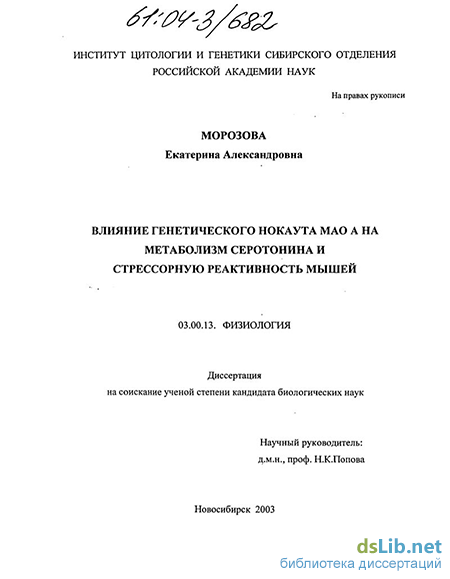 Морозова Екатерина Алекcандровна. Влияние генетического нокаута МАО на метаболизм серотонина и стрессорную реактивность мышей : Дис. ... канд. биол. наук : 03.00.13 : Новосибирск, 2003 104 c. РГБ ОД, 61:04-3/682