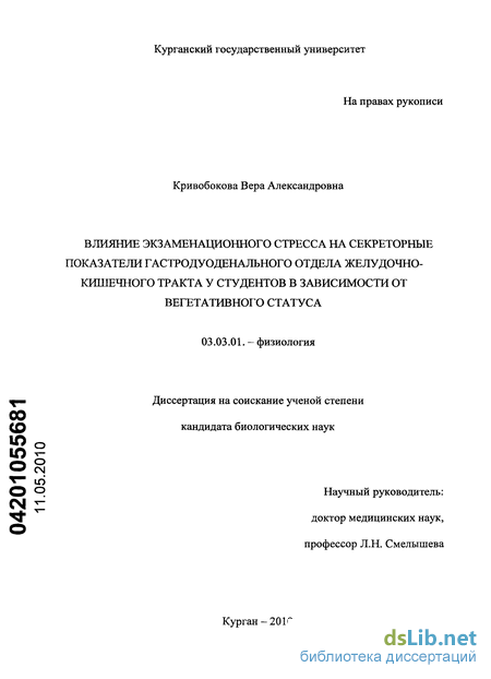 Исследованию вариабельности сердечного ритма у студентов посвящено много работ (И.В. Ефимова, Е.В. Ениколопова, 1987; А.С. Фаустов, Ю.В. Щербатых, 2000, 2001; А.Д. Ноздрачев, Ю.В. Щербатых, 2001; Э.С. Геворкян с соавт., 2003; О.М. Скибина с соавт., 2004; П.А. Байгужин, О.В. Байгужина, 2005; О.В. Авилов, К.В. Судаков, 2008). Проведены исследования по сравнению особенностей вариабельности сердечного ритма у студентов, проживающих в различных природно-климатических регионах (Н.А. Агаджанян, Л.Д. Цатурян, 2008), в зависимости от типа ментальной нагрузки (О.В. Байгужина, Д.З. Шибкова, 2008). Большое количество работ посвящено изучению влияния сдачи экзамена на вегетативные показатели сердечно-сосудистой системы (В.В. Плотников, 1983; Ю.В. Щербатых, 1999, 2000, 2001; Д.А. Димитриев с соавт., 2008 и др.). Исследования, в которых изучалось влияние экзаменационного стресса на секреторные показатели желудочной и поджелудочной секреции в зависимости от исходного тонуса автономной нервной системы в научной литературе практически не встречалось, кроме работы Л.Н. Смелышевой (2007). Автор подробно рассматривала изменения показателей желудочной секреции, возникающих при экзаменационном стрессе у студентов, различающихся исходным вегетативным тонусом в условиях стимуляции желудочных желёз.