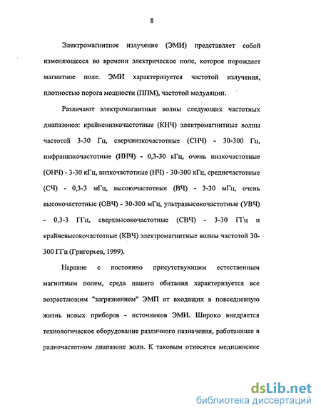 Исследования влияния ЭМИ на биологические объекты ведутся более 50 лет. В литературе насчитывается большое количество публикаций о влиянии ЭМИ на живые организмы. Установлено, что организм человека и животных реагирует на воздействие ЭМИ (Андреев и др., 1985; Голант и др., 1994; Новоселова и др., 2002; Dardanoni, 1985; Perrin, 2002). Эффекты ЭМИ и степень их выраженности сильно различаются и зависят от параметров излучения