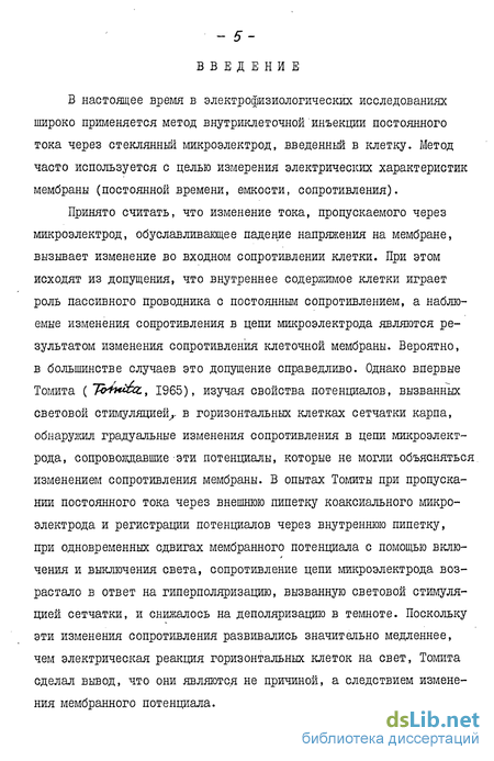 Принято считать, что изменение тока, пропускаемого через микроэлектрод, обуславливающее падение напряжения на мембране, вызывает изменение во входном сопротивлении клетки. При этом исходят из допущения, что внутреннее содержимое клетки играет роль пассивного проводника с постоянным сопротивлением, а наблю-емые изменения сопротивления в цепи микроэлектрода являются результатом изменения сопротивления клеточной мембраны. Вероятно, в большинстве случаев это допущение справедливо. Однако впервые Томита ( Tb^wtiz, 1965), изучая свойства потенциалов, вызванных световой стимуляцией,- в горизонтальных клетках сетчатки карпа, обнаружил градуальные изменения сопротивления в цепи микроэлектрода, сопровождавшие эти потенциалы, которые не могли объясняться изменением сопротивления мембраны. В опытах Томиты при пропускании постоянного тока через внешнюю пипетку коаксиального микроэлектрода и регистрации потенциалов через внутреннюю пипетку, при одновременных сдвигах мембранного потенциала с помощью включения и выключения света, сопротивление цепи микроэлектрода возрастало в ответ на гиперполяризацию, вызванную световой стимуляцией сетчатки, и снижалось на деполяризацию в темноте. Поскольку эти изменения сопротивления развивались значительно медленнее, чем электрическая реакция горизонтальных клеток на свет, Томита сделал вывод, что они являются не причиной, а следствием изменения мембранного потенциала. - 6 ~