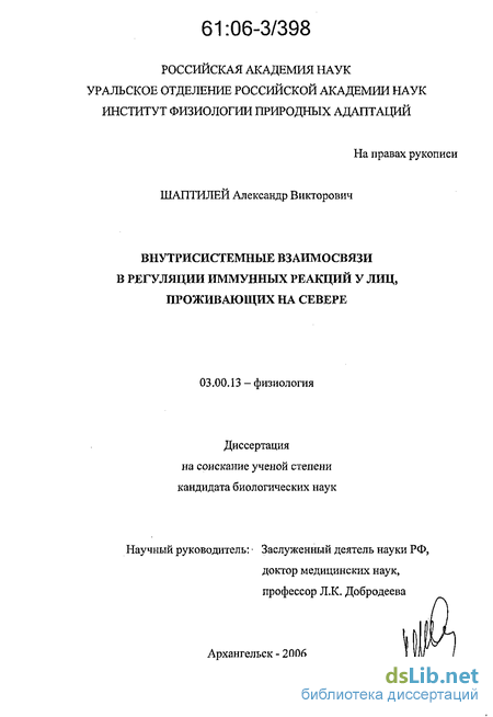 Апробация работы. Материалы диссертации доложены и обсуждены на научных семинарах Института физиологии природных адаптации УрО РАН (Архангельск, 2001-2005), заседаниях Ученого Совета ИФПА УрО РАН (Архангельск, 2001-2005), заседаниях Архангельского общества физиологов им. И.П. Павлова (Архангельск, 2003-2005), 1-ой конференции иммунологов (Екатеринбург, 2001), Пятом конгрессе иммунологов и аллергологов «Современные проблемы аллергологии, иммунологии и иммунофармакологии» (Москва, 2002).