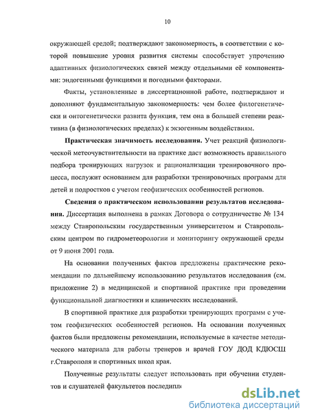 В спортивной практике для разработки тренирующих программ с учетом геофизических особенностей регионов. На основании полученных фактов были предложены рекомендации, используемые в качестве методического материала для работы тренеров и врачей ГОУ ДОД КДЮСШ г.Ставрополя и спортивных школ края.