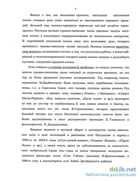 Среди многих проблем современной ингушской фольклористики одной из значительных является отсутствие комплексного монографического исследования ингушского песенного героического эпоса. Решению этой проблемы и посвящено данное диссертационное исследование, автор которого надеется, что тем самым им будет внесён определенный вклад в развитие ингушской фольклористики. Одновременно исследование в какой-то мере пополнит копилку северокавказской фольклористики в плане выявления общетипологических особенностей.