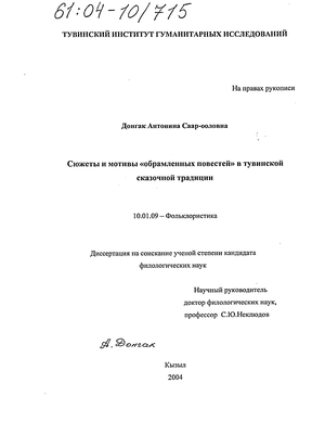 анализу и вводятся в научный оборот. В данной работе также впервые в тувинской (шире - саяно-алтайской) фольклористике поднимается вопрос о влиянии инонациональных (монгольских) книжных произведений на развитие и обогащение местной сказочной традиции и фольклор тюркских народов Сибири, к которым относятся тувинцы, рассматривается через призму монгольско-тибетско-индийских литературно-фольклорных взаимосвязей.
