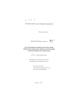 Песковатсков Виктор Юрьевич. Исследование обратимости разностных операторов методами спектральной теории упорядоченных пар операторов : диссертация ... кандидата физико-математических наук : 01.01.01.- Воронеж, 2001.- 100 с.: ил. РГБ ОД, 61 02-1/746-9