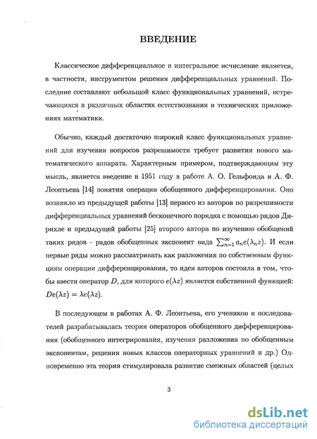 Обычно, каждый достаточно широкий класс функциональных уравнений для изучения вопросов разрешимости требует развития нового математического аппарата. Характерным примером, подтверждающим эту мысль, является введение в 1951 году в работе А. О. Гельфонда и А. Ф. Леонтьева [14] понятия операции обобщенного дифференцирования. Оно возникло из предыдущей работы [13] первого из авторов по разрешимости дифференциальных уравнений бесконечного порядка с помощью рядов Дирихле и предыдущей работы [25] второго автора по изучению обобщений таких рядов- рядов-обобщенных экспонент вида Yl =i ane( nz) И если. первые ряды можно рассматривать как разложения по собственным функциям операции дифференцирования, то идея авторов состояла в том, чтобы ввести оператор D, для которого e{Xz) является собственной функцией: De(Xz) = Xe(Xz).
