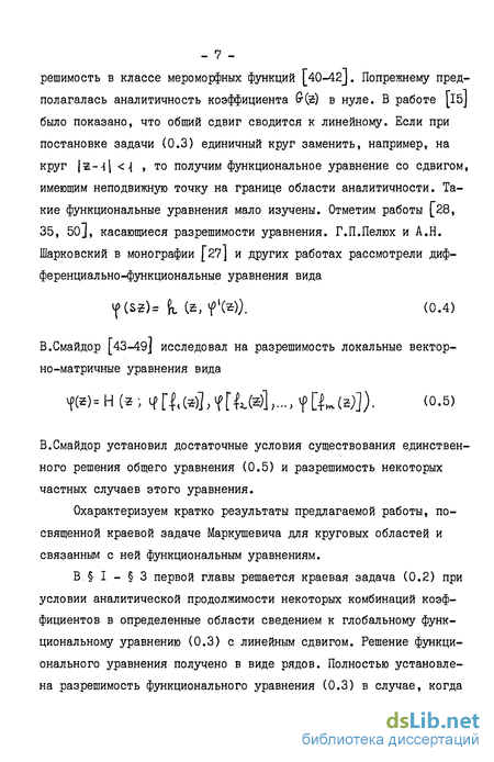 Функциональное уравнение (0.3) и более общие уравнения изучались М.Кучмой, В.Смайдором, Я.Матковским, П.Мирбергом и многими другими авторами [37, 38]. В случае (2) = 2-1 ,габ/А/, (2)=S? локальное уравнение (0.3) исследовал М.Кучма [39J. На функцию Q-(z) были наложены такие ограничения, что уравнение оказалось неразрешимым. Исходя из этого факта, последующие авторы не рассматривали случай особенности в неподвижной точке. П.Мирберг [38] решил локальное уравнение (0.3) при условии (J(O) 0 . Л.С.Дарбинян б] по сути дела повторил его результат. Я.Матковский исследовал глобальное уравнение (0.3) на раз- решимость в классе мероморфных функций [40-42J. Попрежнему предполагалась аналитичность коэффициента ( в нуле. В работе [I5J было показано, что общий сдвиг сводится к линейному. Если при постановке задачи (0.3) единичный круг заменить, например, на круг г-ч! \ , то получим функциональное уравнение со сдвигом, имеющим неподвижную точку на границе области аналитичности. Такие функциональные уравнения мало изучены. Отметим работы [28, 35, 50J, касающиеся разрешимости уравнения. Г.П.Пелюх и А.Н. Шарковский в монографии [27] и других работах рассмотрели дифференциально-функциональные уравнения вида В. Смайдор [43-49] исследовал на разрешимость локальные вектор-но-матричные уравнения вида