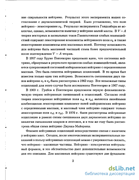Первый эксперимент по измерению массы нейтрино, основанный на методе Ферми-Перрина, дал верхнее значение mv < 500 эВ, которое в пятидесятых годах было улучшено до т„ < 250 эВ. Стало очевидным, что масса нейтрино, если и отличается от нуля, то имеет значение намного меньшее, чем масса электрона. Этот факт послужил главной причиной того, что в 1957 году, после обнаружения нарушения четности в экспериментах по /?-распаду, авторы двухкомпонентной теории нейтрино -Ландау, Салам, Ли и Янг - предложили рассматривать нейтрино как безмассовую частицу, поле которой описывается или левосторонним спинором vi или правосторонним vr.